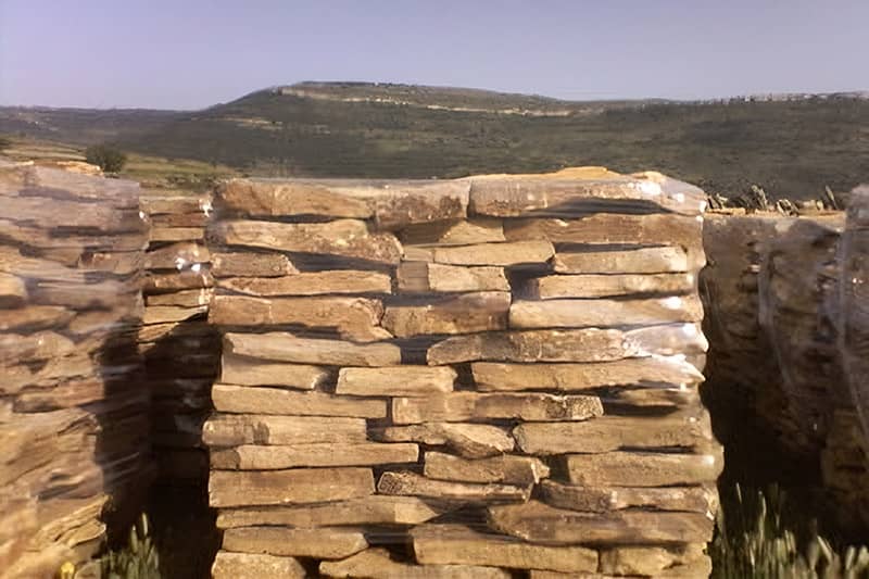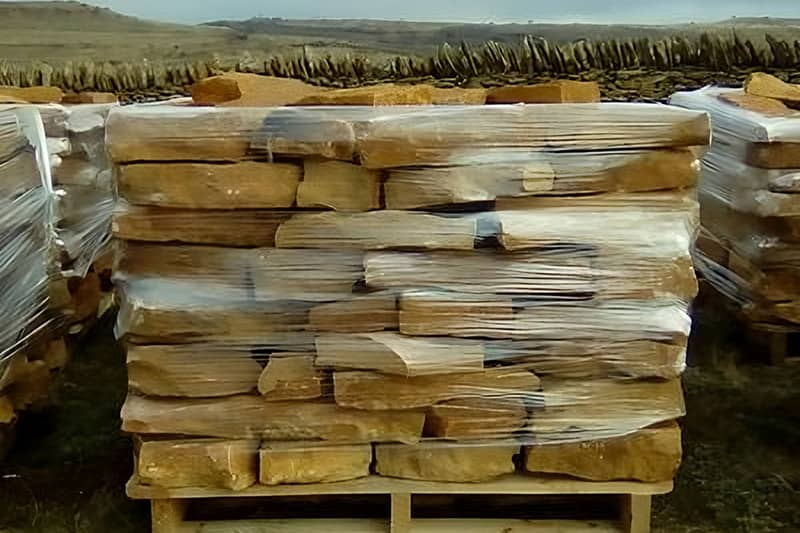 Tacos de piedra irregular de más de 7 centímetros de grosor. Esta piedra es ideal para la elaboración de muros, Se sirve en palets de 8 m². El peso aproximado de un palet es de 1000 Kgs.